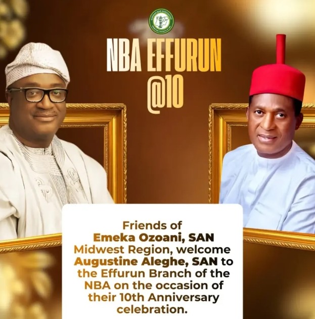 Friends of Chief Emeka Ozoani, SAN, Midwest Region, are set to welcome the revolutionary former President of the Nigerian Bar Association, Augustine Alegeh, SAN, to Effurun on the occasion of the 10th Anniversary celebration of the Effurun Branch taking place in Delta State.